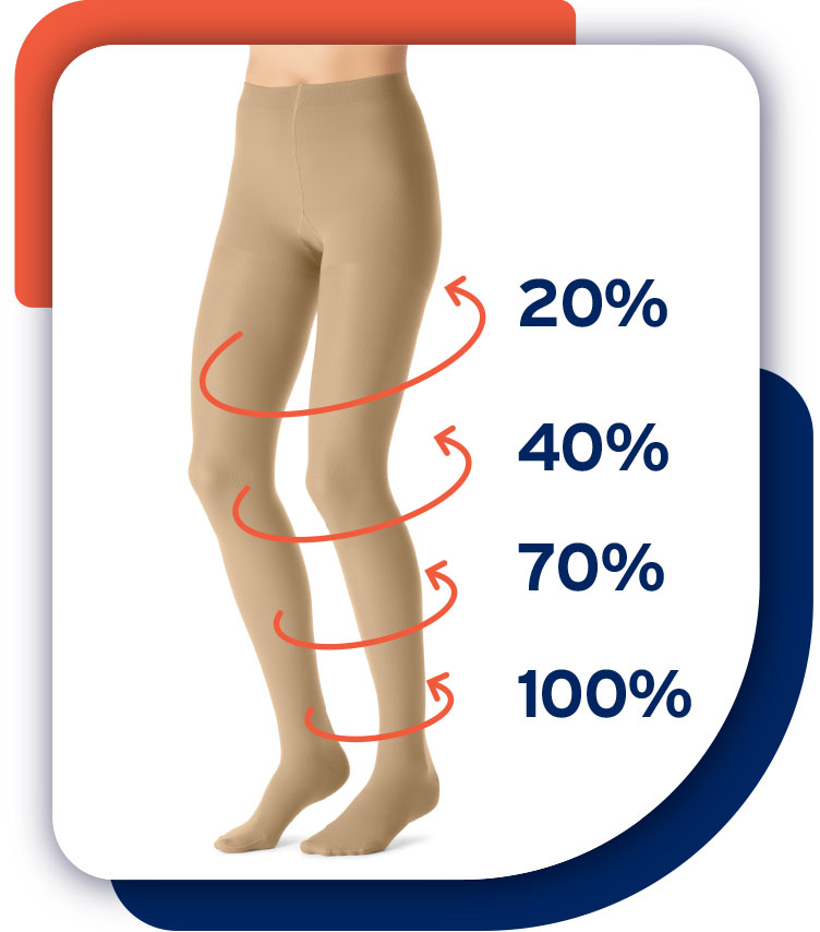 La terapia compresiva gradual ejerce una presión decreciente en la pierna, de forma que en el tobillo la compresión es mayor y decrece a medida que nos acercamos a la ingle. Esta diferencia de compresión es la que facilita que la sangre ascienda de nuevo hasta el corazón, favoreciendo así el retorno venoso.6